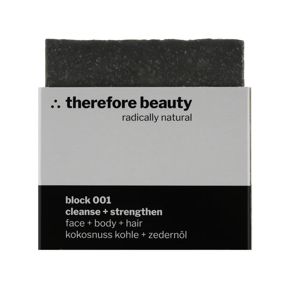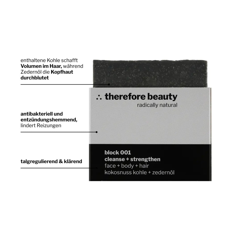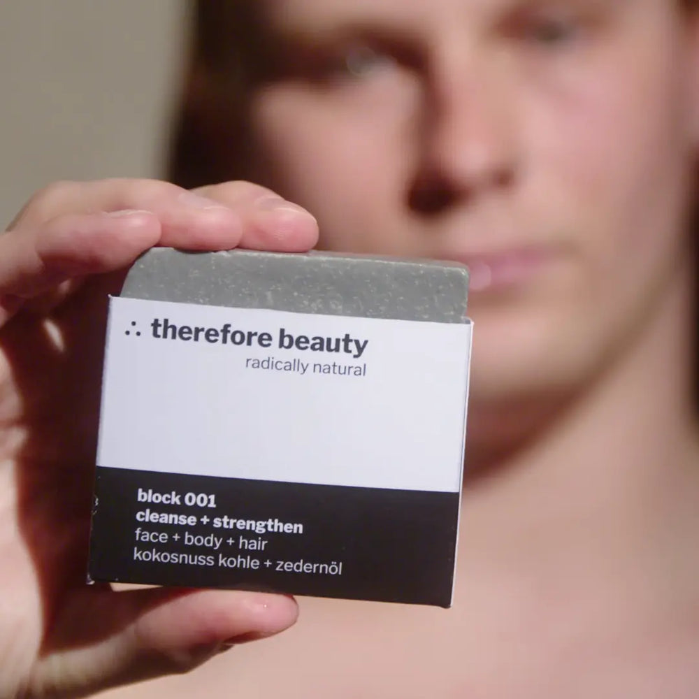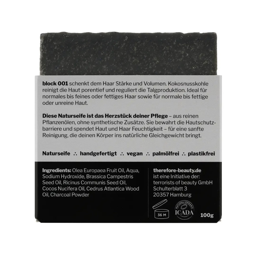 Block 001 ist unsere stärkende Seife für alle, die klärende Reinigung mit kraftvoller Pflege verbinden wollen: