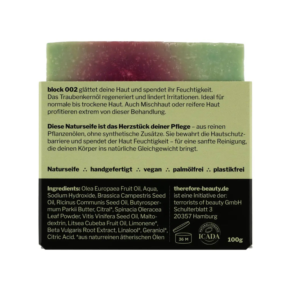 Block 002 ist unsere sanft rückfettende Seife für alle, die milde Reinigung mit regenerierender Pflege kombinieren wollen: