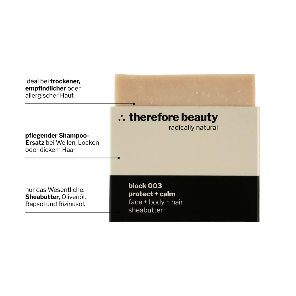 Block 003 ist unsere pure, reichhaltige Seife – für alle, die trockene, sensible oder zu Irritationen neigende Haut sanft reinigen und anspruchsvolles Haar pflegen möchten: